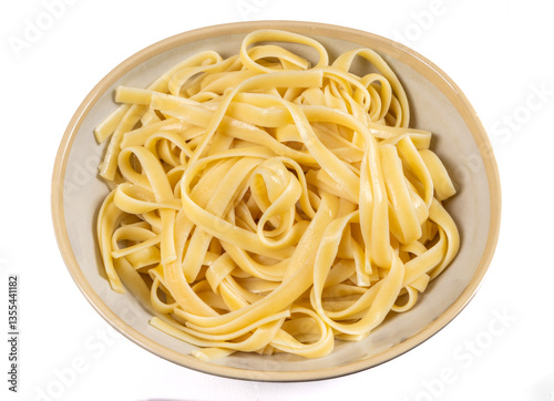 A dish of cooked fettuccine or linguini pasta isolated on white