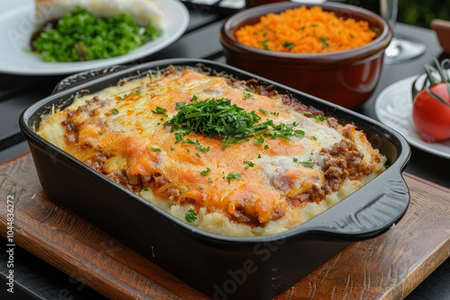 A dish of escondidinho de carne, a layered casserole with shredded beef and creamy mashed cassava, topped with melted cheese