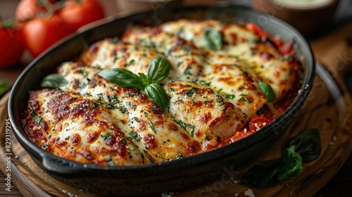 A dish of savory chicken Parmesan, topped with melted cheese.