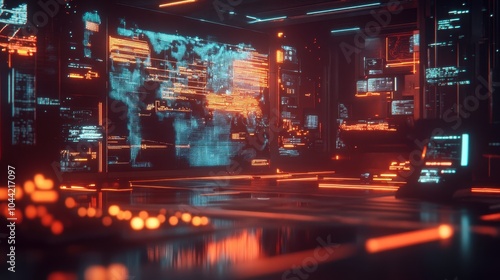 A dispatch center with a massive screen showing live tracking of logistics data across multiple global routes.