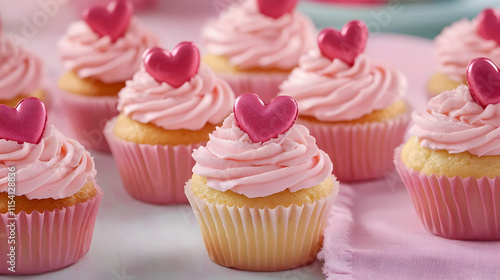 A display of delightful cupcakes topped with pink frosting and heart-shaped decorations.