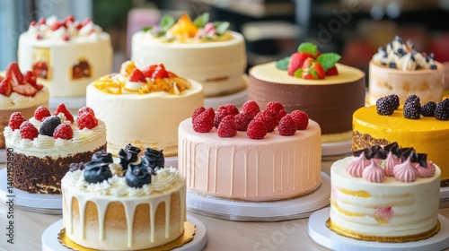 cake, bakery, pastry, shop, display, decorated, variety, treat, dessert, sweet, confection, icing, frosting, layer, colourful, festive, celebration, delicious, epicure, presentation, tasty, aesthetic, visual, ingredient, eatery, favor, balanced, diverse, alimentary, wholesome, diet, meal, nourishment, fresh, culinary, cream, sprinkle, chocolate, vanilla