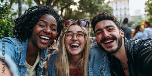 A diverse group of friends laughing and taking selfies at an outdoor café