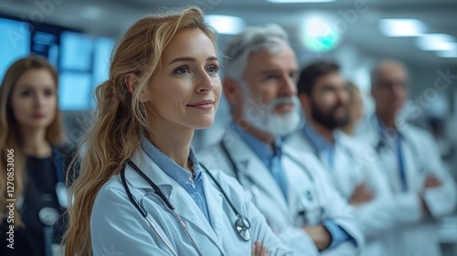 A diverse group of healthcare professionals in white coats are focused on their work. The image shows both men and women in a clinical setting with serious expressions.