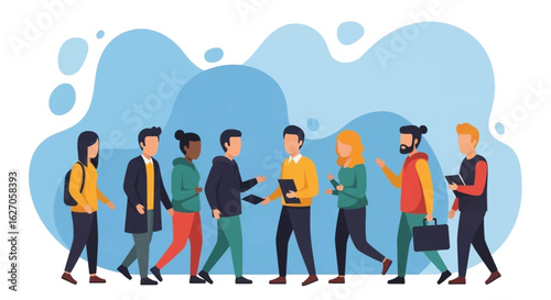 people, group, diverse, communication, interaction, networking, collaboration, teamwork, discussion, meeting, walking, talking, connection, community, modern, technology, digital, business, social, lifestyle, urban, professional, casual attire, man, woman, young, adult, colleague, friends, corporate, startup, innovation, idea, sharing, exchanging, information, development, growth, future, abstract, blue, background, illustration, vector, graphic, concept, online, cyberspace, device