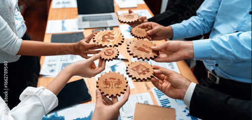 A diverse group of professionals collaborates in a modern office, exchanging innovative ideas represented by gears and charts, emphasizing teamwork and strategic planning. Amity
