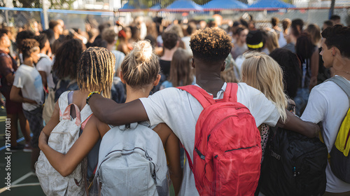 diverse, young adult, oneness, community, anticipation, casual attire, backpack, crowd, social gathering, friendship, sunlight, relaxed, youth culture, togetherness, excitement, fashion, leisure, celebration, group, happiness, stylish, blonde hair