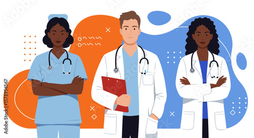 A Diverse Medical Team of Three Professionals Standing Together Confidently in Their Scrubs and Lab Coats Ready to Provide Care