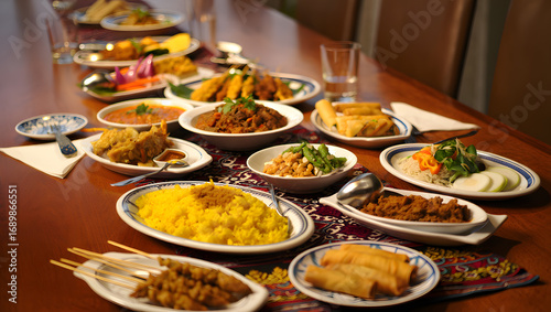 A diverse selection of delicious and authentic dishes, served family-style on a wooden table, perfect for sharing and celebrations