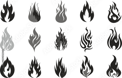 A diverse set of isolated fire flame icons in black and white. Stylized vector silhouettes representing heat, energy, and burning concepts.