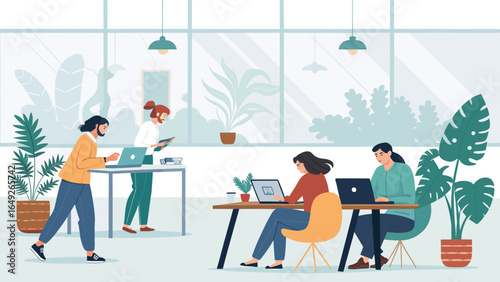 office, workspace, teamwork, collaboration, business, professional, people, working, laptop, computer, modern, contemporary, bright, natural, light, plant, greenery, indoor, productivity, startup, company, corporate, employee, staff, creative, design, technology, digital, comfortable, roomy, interior, furniture, desk, chair, casual attire, diverse, team, communication, innovation, strategy, development, success, growth, well-being, healthy, environment, illustration, vector, cartoon