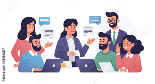 A diverse team of professionals engaged in a collaborative business meeting, discussing strategy and brainstorming new ideas.