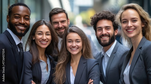 A diverse team of professionals in business attire smiling and looking at the camera, symbolizing teamwork and corporate success.