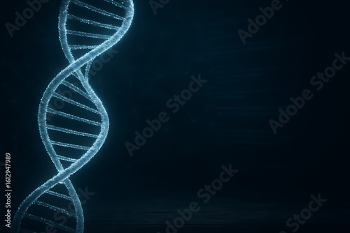 A DNA double helix structure on a dark background, symbolizing science and genetics.