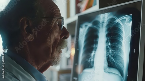A doctor examines an X-ray of lungs, reflecting on a patient's health condition.