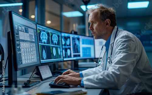 A doctor in a white coat examines brain scans on multiple computer monitors in a modern medical facility