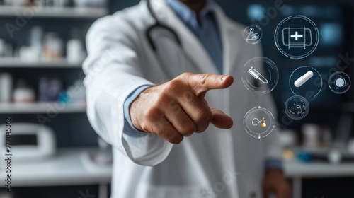 A doctor's hand pointing forward, the arm clad in a white doctor's coat. In the foreground, several circles containing medical icons such as a stethoscope, a syringe, a pill, and a heart monitor.