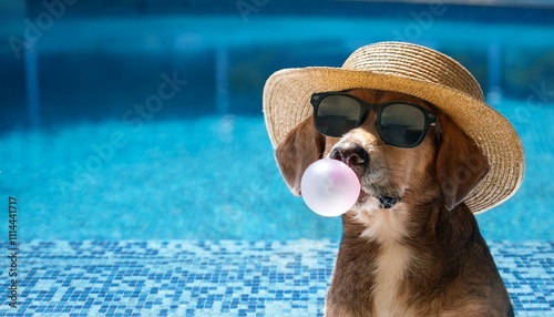 A dog blowing up a chewing gum with sunglasses and wearing a straw hat; a funny picture of a dog wearing sunglasses and straw hat on vacation; a dog looking hilarious and cool while blowing up a gum