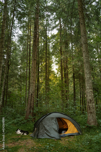 A dog sleeps near the tent. adventures with pets. camping in forest