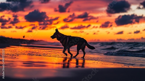 dog, beach, sunset, ocean, wave, silhouette, nature, sky, cloud, sand, animal, pet, evening, landscape, calmness, horizon, water, scene, play, freedom, beauty, warmth, peaceful, shore, paw, adventure, exploration, environment, coastal, sun, light, movement, photo, companionship, joy, summer, scenic, playful, vibrant, colours, relaxation, atmosphere, coastline, wildlife, serenity, dusk
