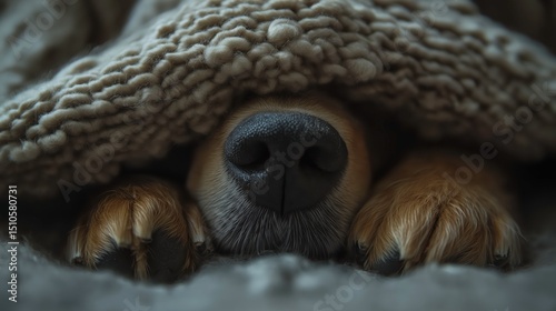 A dog’s nose and front paws peek out from beneath a thick knitted blanket, capturing a peaceful, cosy moment of rest and hidden warmth in soft indoor lighting