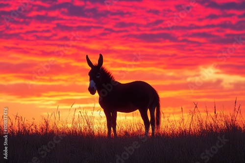 A donkey silhouetted against a vibrant sunset sky, with tall grass in the foreground.