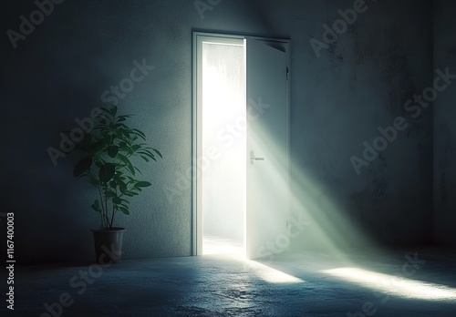 room, corner, grey, wall, carpet, light, colours, beam, door, ajar, white, frame, bright, shine, window, outside, view, green, plant, pot, large, size, interior, scene, calm, serene, cosy, warm, atmosphere, ambience, still, life, natural, greenery, decoration, home, tranquil, peaceful