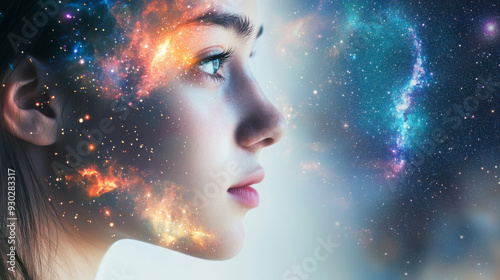 A double multiple exposure abstract portrait of a dreamy young woman, with a galaxy and universe space visible inside her head. The image blends her face with cosmic elements, symbolizing a connection