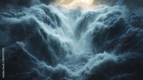 A dramatic, abstract depiction of a stormy sky with swirling clouds illuminated by a ray of light.