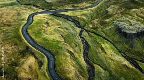 A dramatic aerial view of the Westfjords road, snaking through Iceland untouched natural landscape.