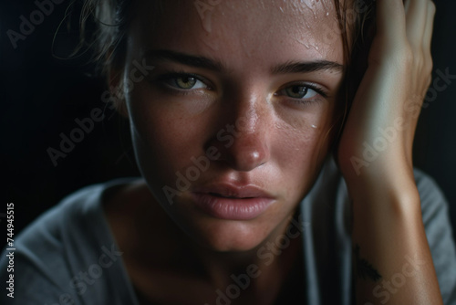 dramatic, dark, closeup, portrait, young, woman, face, expression, mood, intensity, shadow, beauty, emotion, gaze, sharpened, detail, artistic, lighting, mysterious, depth, feminine, elegance, contrast, bold, powerful, character, individuality, introspective, reflective, captivating