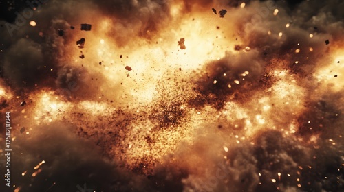 A dramatic explosion illustrating the power of energy release, surrounded by fiery debris and smoke clouds. Perfect for showcasing action and intensity.