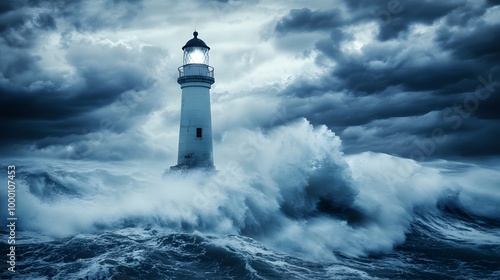 A dramatic lighthouse stands resilient amid towering waves and dark storm clouds, symbolizing strength and guidance during turbulent conditions.