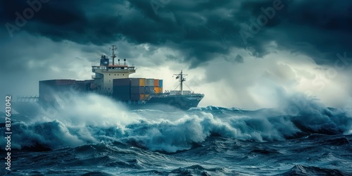 A dramatic photo of a container cargo freight ship braving stormy seas, emphasizing the resilience and strength of maritime transportation.