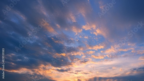 A dramatic sunset with a sky full of clouds. The clouds are illuminated with hues of orange, pink, and purple, contrasting against the darker blue and indigo areas of the sky. Cloud background.