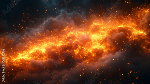 A dramatic,intense and spectacular explosion with raging flames,burning pyrotechnic blaze and fiery combustion creating a powerful,turbulent and cataclysmic scene of destruction and chaos.