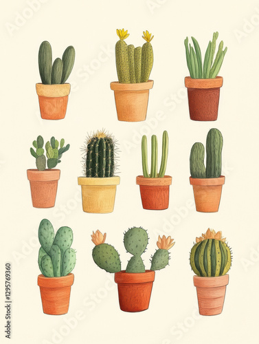 drawing, bunch, cactus, different, size, colours, plant, variety, cactus, pot, nature, green, garden, illustration, set, succulent, flower, houseplant, cute, decorative, botany, vector, summer, design, exotic, collection, desert, cartoon, graphic, botanical, mexican, art, flora, doodle, background, style, floral, pattern, drawn, element, tropical, icon, flowerpot, home, happy, leaf, hand, mexico, adorable