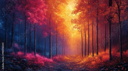 surreal, imagination, neon, glowing, journey, tree, solid, through, dreamlike, hue, bright, background, forest