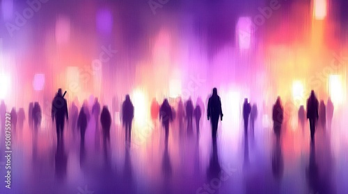 A dreamy scene filled with silhouettes of people against a backdrop of colorful lights, creating an atmosphere of mystery and intrigue in an urban setting.