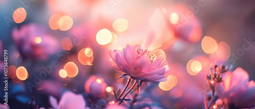 A dreamy scene with soft pink flowers illuminated by gentle bokeh lights, creating a romantic and ethereal atmosphere.