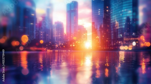 A dreamy sunset scene featuring blurred city buildings with their reflection shimmering in the water, capturing the tranquil essence of urban life.