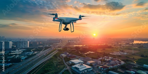 A drone flying over an industrial complex, capturing aerial footage of factories and facilities for inspection and monitoring