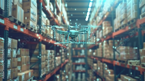 A drone flying through a warehouse, conducting inventory management with advanced scanning technology among shelves of stacked boxes.