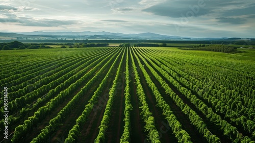A drone view of a sprawling hop farm with geometric rows of green vines and a distant horizon