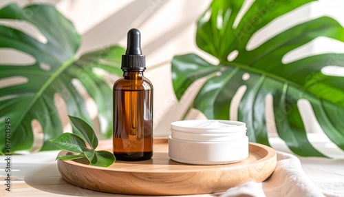 A dropper bottle and a cream jar on a wooden tray, adorned with green leaves, against a backdrop of monstera leaves.