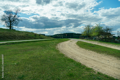 A dry sandy road passes through a field under the scorching sun and clouds. Dirt road outside the city in the village. Arid climate on earth. Climate change and its consequences.