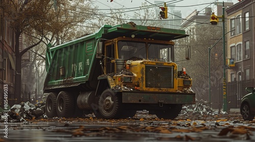 horizontal, men at work, people, work, truck, service, maintenance, driver, man, junk, business, outside, recycling, vehicle, removal, collection, machinery, clean, industrial, transportation, orange, wheel, dirty, bulldozer, outdoors, machine, old, traffic, car, equipment, yellow, green, urban, construction, road, disposal, environment, cleanup, dump, broken, container, waste, plastic, trash, asphalt, garbage, city, street, pavement