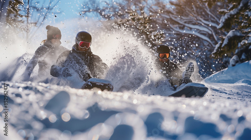 a dynamic action shot of a group of friends sledding down a snowy hill with, leaving a cloud of snow behind them