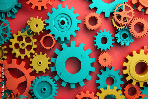 A dynamic array of colorful gears in yellow, turquoise, and red hues set against a vivid red background, highlighting the intricate mechanisms.