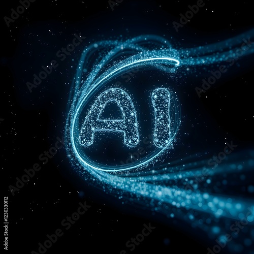 A dynamic background with swirling particles forming an AI symbol, set against a dark starry sky, emphasizing the mystery of artificial intelligence.